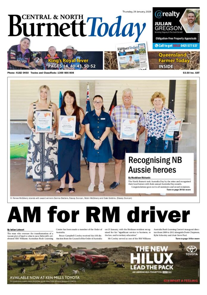 SB – Central and North Burnett Today – 29th January 2026 Subscribe or Login to see the rest of the content. Username Password * Remember Me Forgot Password News ‘Flying fox’ inbound at Benarkin 23/02/2026 The South Burnett Regional Council is installing a new flying fox zip line at Benarkin's First Settlers' Park to the tune of $85,000. Council advised... Giving to breakfast club 23/02/2026 The ladies of Wooroolin QCWA have gone above and beyond with another donation to the Kingaroy State High School Breakfast Club. On Tuesday, 10... Records, medals and PBs 23/02/2026 It was action on the track and field as athletes from Nanango attended the 2026 regional competition. Over the weekend of Saturday 7 February...