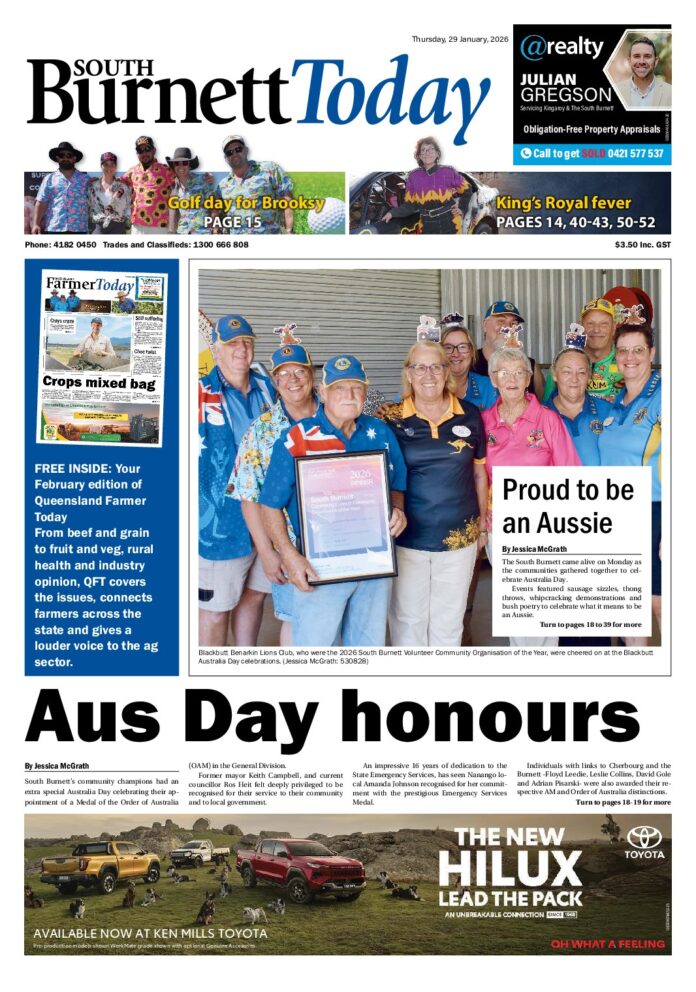 SB – South Burnett Today – 29th January 2026 Subscribe or Login to see the rest of the content. Username Password * Remember Me Forgot Password News ‘Flying fox’ inbound at Benarkin 23/02/2026 The South Burnett Regional Council is installing a new flying fox zip line at Benarkin's First Settlers' Park to the tune of $85,000. Council advised... Giving to breakfast club 23/02/2026 The ladies of Wooroolin QCWA have gone above and beyond with another donation to the Kingaroy State High School Breakfast Club. On Tuesday, 10... Records, medals and PBs 23/02/2026 It was action on the track and field as athletes from Nanango attended the 2026 regional competition. Over the weekend of Saturday 7 February...