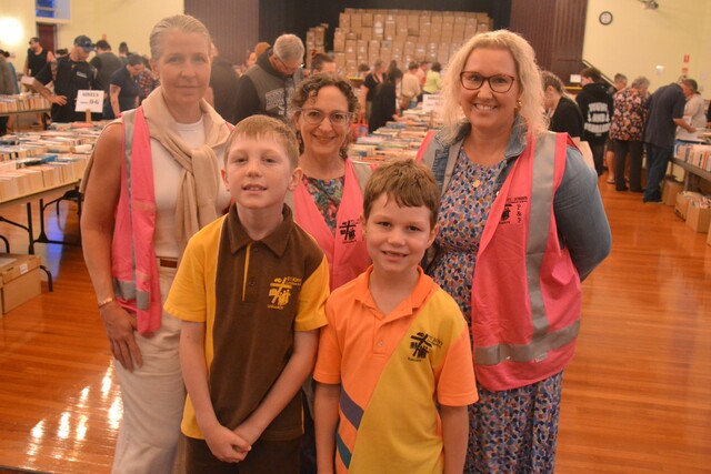 Bookarama volunteers Bec Cameron, Caz Dingle and Angela Fechner with St John's Lutheran State School students Harrison and Nicholas Meehan at the VIP launch event. (Jessica McGrath: 469164_12)