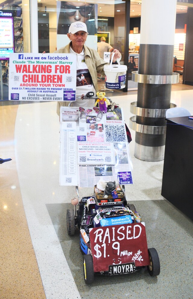Claude Harvey stands with his lawnmower in Kingaroy Shoppingworld as he walks for the Bravehearts cause. (Maddison Richards: 468507_01)
