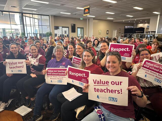 Burnett educators with the Queensland Teachers' Union have vowed to continue striking should the state government not return to the negotiating table over better pay and conditions. (Supplied: QTU)