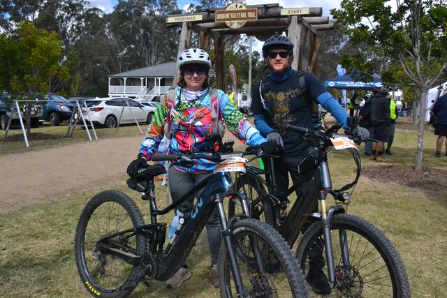 Liz Whelan and Jon De Caluwe arrived at the Yarraman Festival after completing 50km of the Brisbane Valley Rail Trail from Moore. (Jessica McGrath: 494135_10)