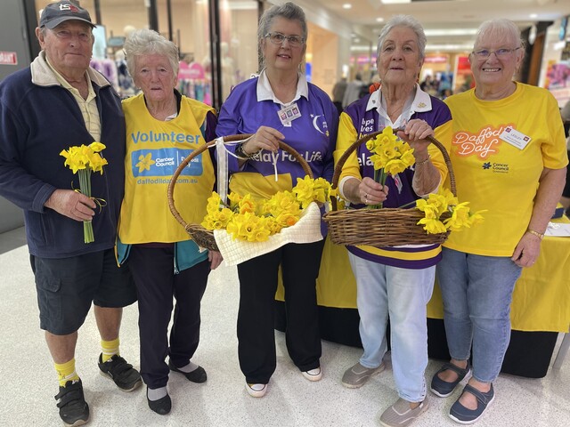 Murray Beil, Gwen McLaughlin, Sheridan Mead-Garget-Bennett, Gwenda Allen and Lesley Gogerly supported Birds of a Feather's Daffodil Day stall. (Jessica McGrath: 497801_01)