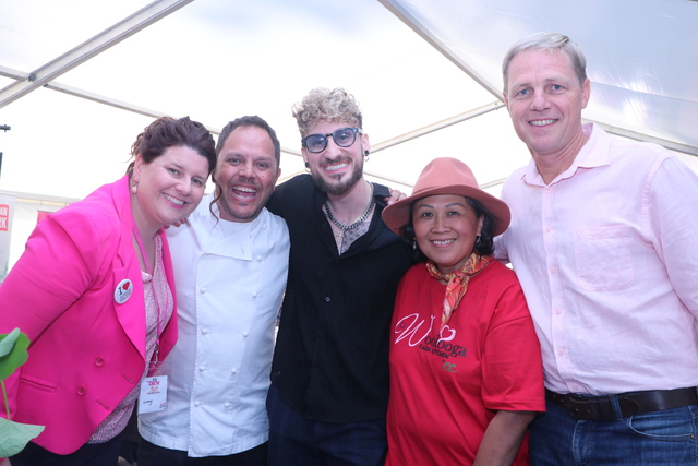 BaconFest host Lucy with celebrity chefs Alastair McLeod and Simone Prest as well as their assistants Cecilia Diaz-Petersen and Josh Gadischke. (Julian Lehnert: 497234_02)