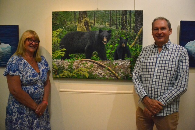 Artist Chris Osborne (right) and his mum Dawn Foster stands with his iconic 'mama and baby black bear' painting inspired by his trip to Alaska and Canada with his mum. (Jessica McGrath: 501687_12)