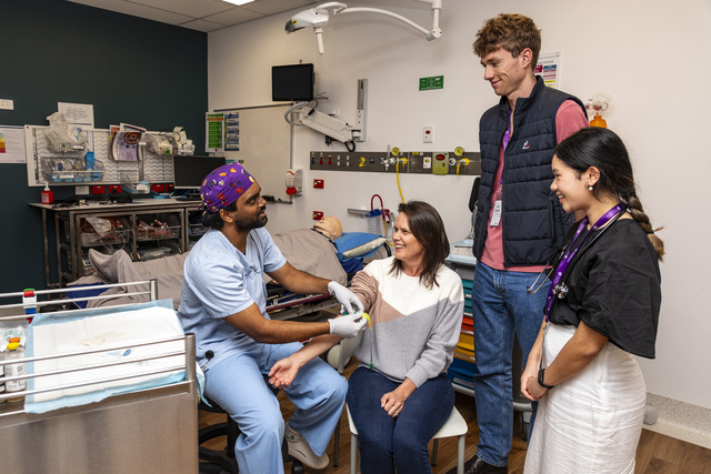 UQ third-year medical student Sai Pabbati demonstrating patient care techniques to first year medical students Estella Le and Jack Cornish. Photo: Supplied by The University of Queensland