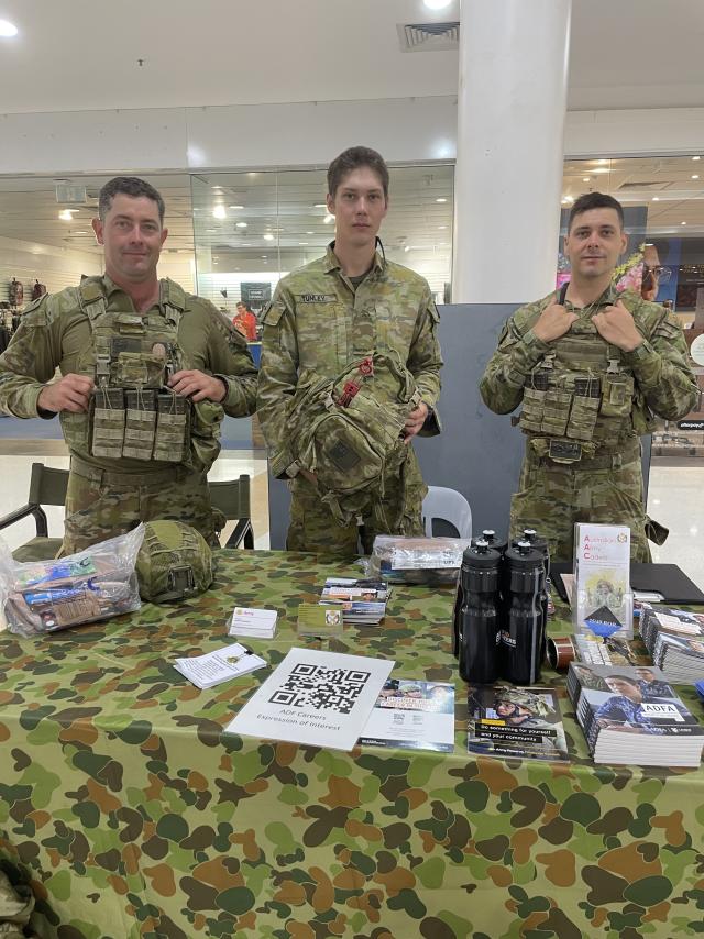 Wondai reserve members Private Will Lawless, Private Hayden Tunley and Private Michael McDonald attended pop-up stalls around the South Burnett to share about how great it is to be a part-time member of the Australian Army Reserve. (Jessica McGrath: 512845_01)