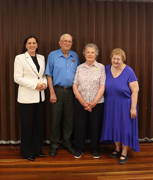 Deb Frecklington and Nanango Indoor Bowls Club President Richelle Hinton stand with new life members Keith and Margaret Springate. (Maddison Richards. 512684_04)