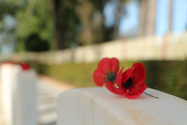Poppies were placed on each of the 22 headstones at Taabinga's war cemetery on Anzac Day. (FILE: 403637_07)