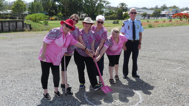 The Biggenden Women's Shed's management committee celebrated breaking the ground at its new headquarters with SES chaplain Allan Sage. (Supplied: Melinda Saw)