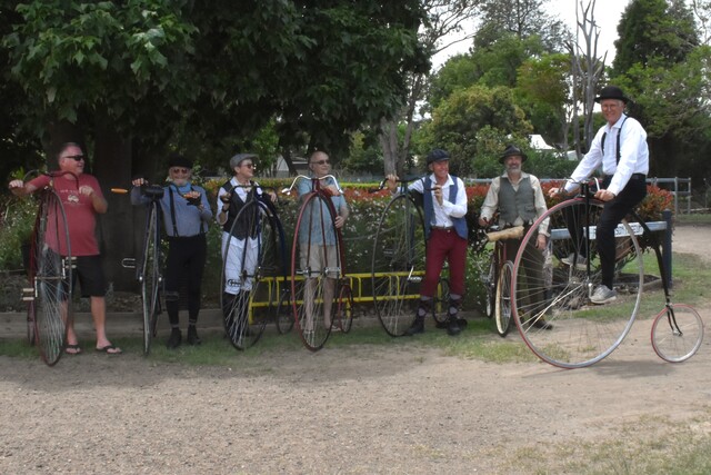 Blackbutt bicycle maker Brett Richardson rides his penny farthing as the fellow Queensland Penny Farthing and Historical Cycle Club members look on. (Jessica McGrath: 519962_01)