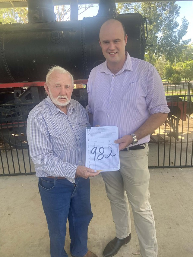 John Bowen (left) handed over a petition to 'save Mingo Crossing Recreational Area' to Callide MP Bryson Head at Mundubbera, with the document having attracted close to 1,000 signatures. (Supplied: John Bowen)