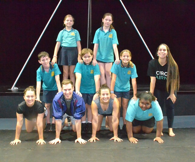Circa Cairns and Kingaroy State School students team up to make a pyramid. (Maddison Richards: 459109_16)