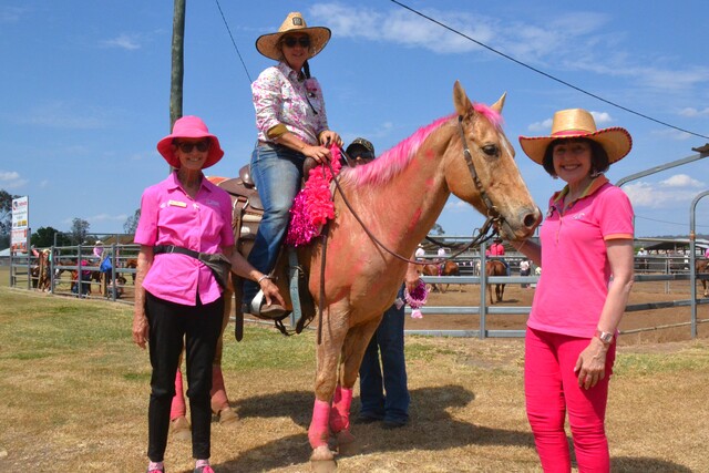McGrath Breast Cancer Nurse Sue Cox, Julie Kidston and South Burnett Mayor Kathy Duff with Bob Marley, who was ridden in the South Burnett Quarter Cutter's 2025 pink day competition by Pippa Anderson. The SBQC raised an incredible total of $13,000 for the McGrath Foundation with their pink day. (Jessica McGrath: 510276_02)