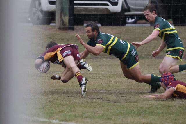 A Warrior dives for Gayndah's try-line. Biggenden won their semi-final match against the Gladiators 20-6. (Supplied: Nicole Gibbs Photography)