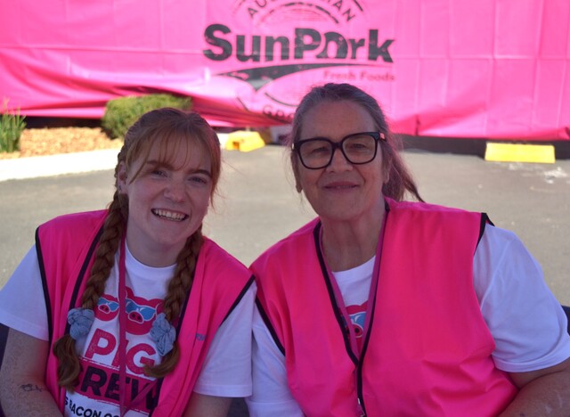 Kingaroy BaconFest pig crew volunteers Jenny and Ashlee were part of the welcoming committee at last year's festival. Will you join the pig crew this year? (Sarah Dimond: 426622_01).