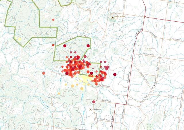 The fire covers a large area around MP Creek Road; a map of fire ‘hotspots’ hosted by the Queensland Government indicates that around 1,000 hectares of land are affected.