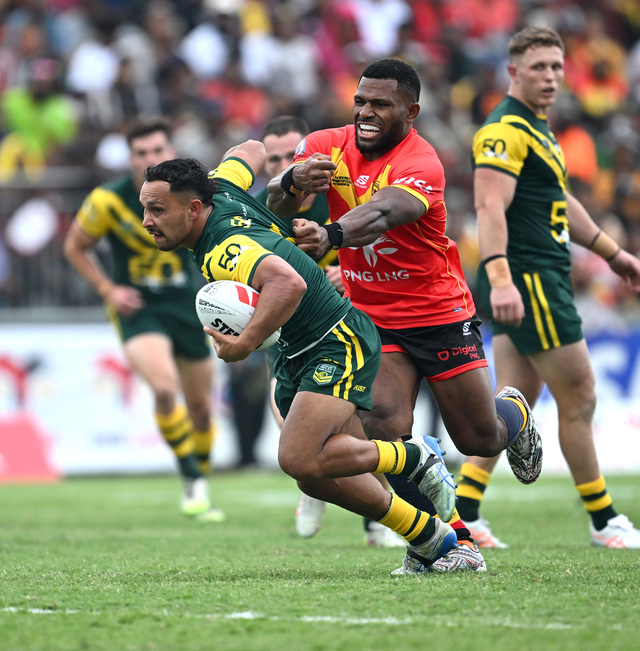 North Burnett footy star Trai Fuller took on Papua New Guinea as part of the Australian Prime Minister's XIII squad on Sunday, marking his debut in green and gold by scoring four tries. (Supplied: NRL)