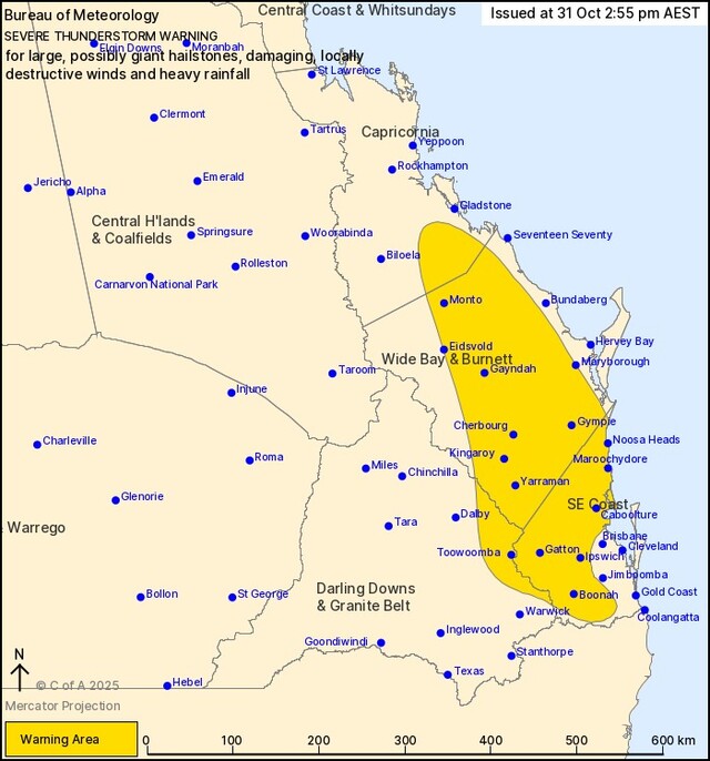 At 2.55pm the Bureau issued a severe thunderstorm warning for the Wide Bay and Burnett, with large, possibly giant hailstones, damaging, locally destructive winds and heavy rainfall possible.