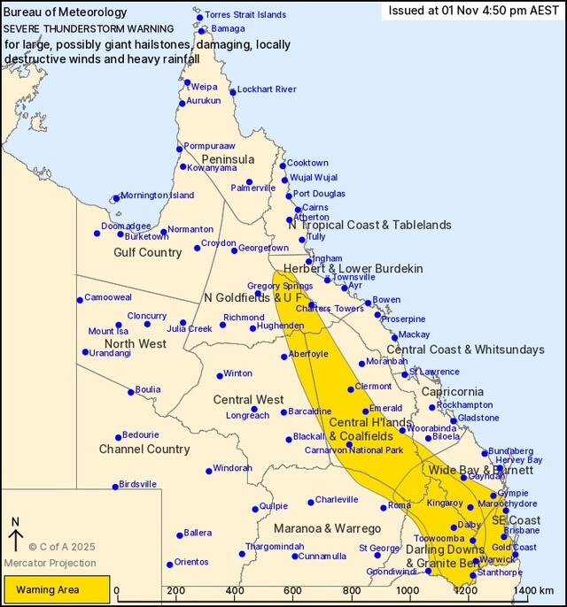 The Bureau reports that ‘very dangerous thunderstorms’ which are likely to produce large, possibly giant hailstones, damaging, locally destructive winds and heavy rainfall that may lead to flash flooding over the next several hours in parts of the Central Highlands and Coalfields, Wide Bay and Burnett, Darling Downs and Granite Belt, Southeast Coast and Maranoa and Warrego districts.