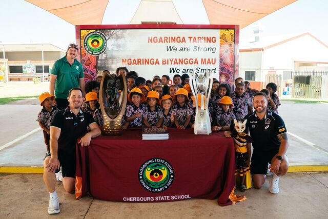 Cherbourg State School's students were thrilled to see the Broncos and NRL trophies up close. (Supplied: Brisbane Broncos)
