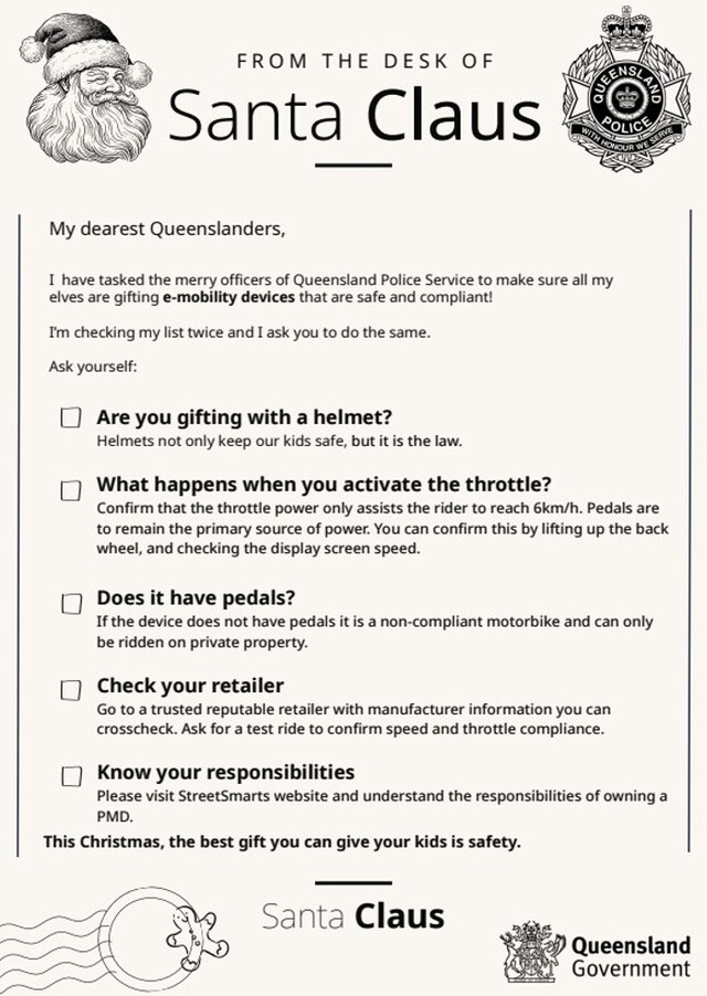 Queensland Police Service is urging parents to understand their legal responsibilities when considering gifting an e-scooter or e-bike this Christmas.